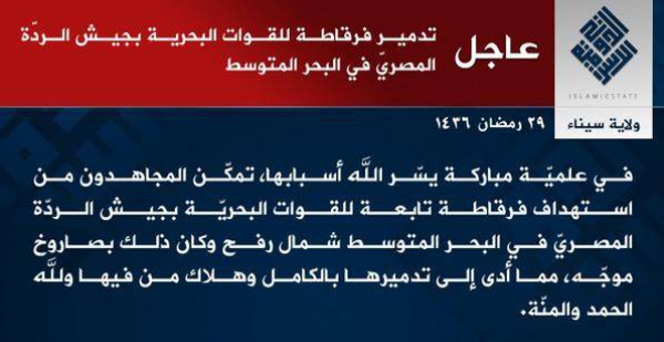 قال العميد محمد سمير المتحدث العسكرى، إنه فى تمام الساعة 9.30 صباح اليوم 16 / 7 / 2015 وأثناء قيام إحدى لنشات الحراسة بمهام تأمين سواحل البحر الأبيض المتوسط أمام مدينة (رفح) اشتبه طاقم لنش حربى فى تحركات بعض العناصر الإرهابية على الساحل، فقامت عناصر الطاقم بمطاردة العناصر المشتبه بها وحدث تبادل لإطلاق النيران مما أسفر عن إشتعال النيران باللنش دون حدوث خسائر فى الأرواح.