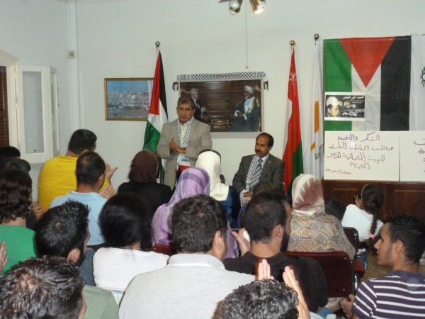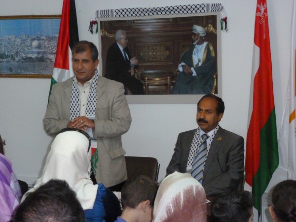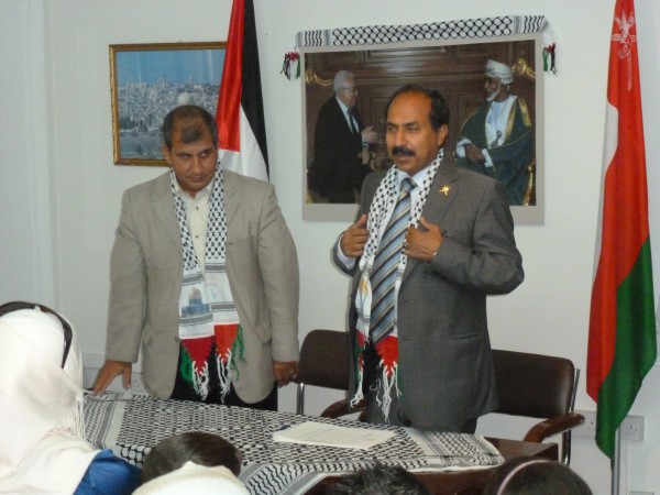 بعد الوقوف دقيقة صمت وقراءة الفاتحة على شهداء فلسطين والامه العربية ، تقدم سفير دولة فلسطين باسم سيادة الرئيس محمود عباس وباسم الحكومة الفلسطينية وباسم وزير الخارجية د. رياض المالكي بالشكر الى سلطنة عمان الشقيقة سلطانا" وحكومة" وشعبا" ، وللهئية العمانية للأعمال الخيرية على ما قدمته للاجئين الفلسطينيين من معونة مالية في وقت تعاضمت فية المعاناة في بلاد اللجوء والغربة. كما توجه بالشكر الى سفير سلطنة عمان الشيخ أحمد الشنفري على مواقفة الصادقة التي تعكس مواقف بلدة الشقيق الى جانب شعبنا الفلسطيني ، وعلى جهودة المتواصلة في تقديم الدعم المالي والتمويني الضروري للاجئين الفلسطيني بالتنسيق والتعاون مع سفارة دولة فلسطين.