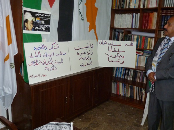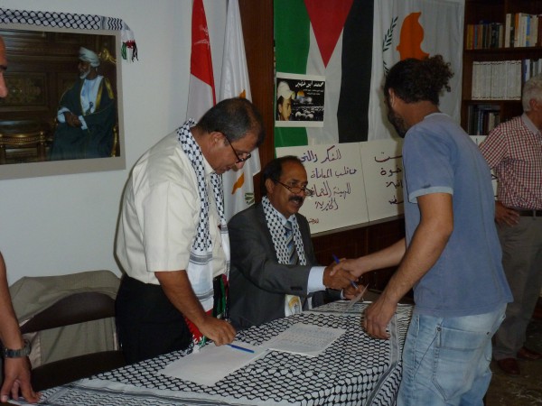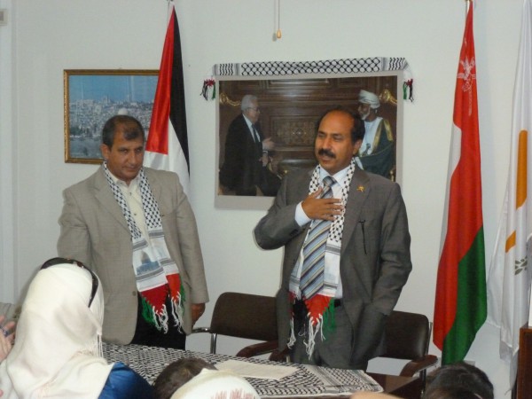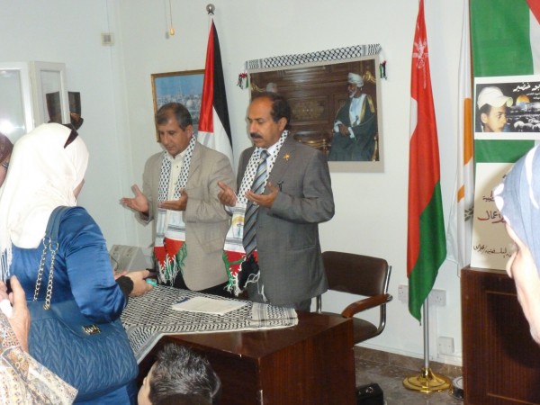 بمناسبة قرب حلول عيد الفطر المبارك وبأشراف سفير سلطنة عمان الشيخ أحمد الشنفري وسفير دولة فلسطين د. وليد حسن وزعت اليوم في مقر سفارة دولة فلسطين في العاصمة القبرصية نيقوسيا الدفعة الثانية من المعونه العمانية المقدمة من قبل الهئية العمانية للأعمال الخيرية على اللاجئين الفلسطينيين الذين فروا من ويلات الحرب في سوريا وحطت بهم الاقدار بعد أنقاذهم من الغرق في جمهورية قبرص.