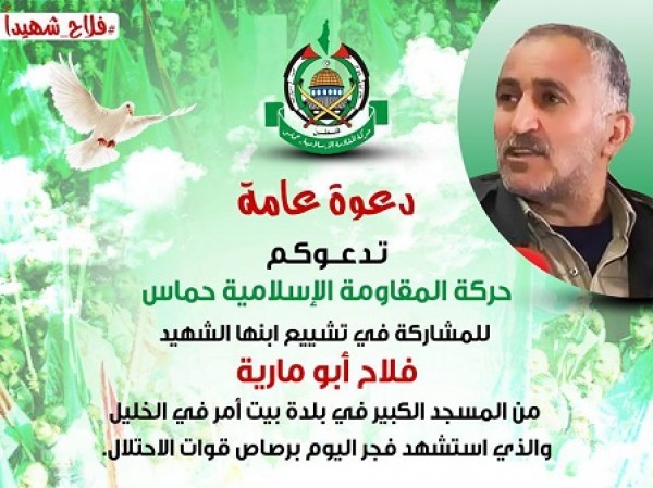 ودعت الحركة جماهير الضفة الغربية المجاهدة، وخاصة أهالي محافظة الخليل، إلى المشاركة الواسعة في تشييع الشهيد أبو مارية، من المسجد الكبير في بلدته بيت أمر.