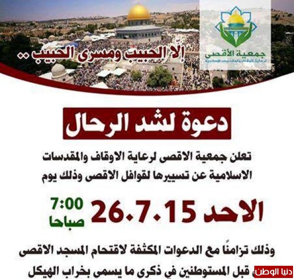تزامنا مع ذكرى ما يسمى خراب الهيكل والذي يصادف اليوم 26.7.2015 عممت جمعية الأقصى لرعاية الأوقاف المقدسات الإسلامية في الداخل الفلسطيني مسبقا دعوة وجهت للأهل في الداخل الفلسطيني عامة ولقادة وأبناء وبنات الحركة الإسلامية لشد الرحال إلى المسجد الأقصى المبارك للتصدي لقطعان المستوطنين الذي حضروا بالمئات لاقتحام المسجد الأقصى في هذا اليوم.