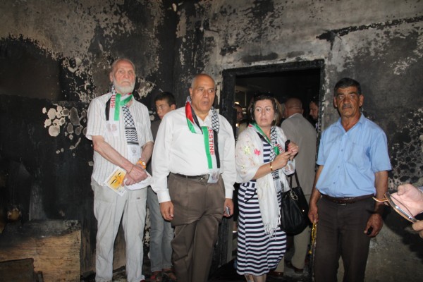 وتجول الوفد برفقة محافظ نابلس اللواء أكرم الرجوب، في منزل الدوابشة الذي أحرقه المستوطنون، وتسببوا باستشهاد الرضيع الذي لم يزد عمره عن عام ونصف العام، وإصابة والديه، وشقيقه ابن الرابعة بحروق صعبة لا يزالون يتعالجون منها.