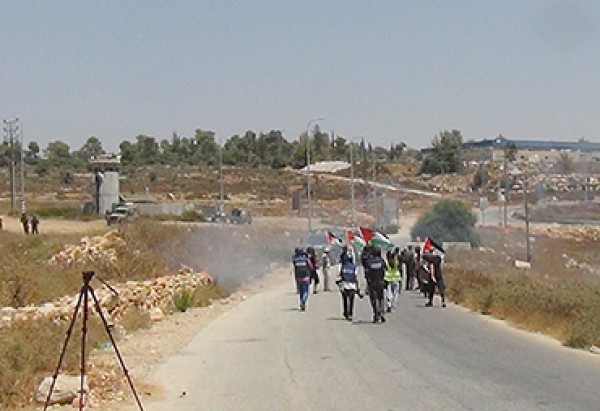 ومع اقتراب المسيره من البوابه الحديدية المغلقه أمطرت قوات الاحتلال الاسرائيلي المتظاهرين بقنابل الغاز المدمع ليصاب العشرات بالاختناق.
