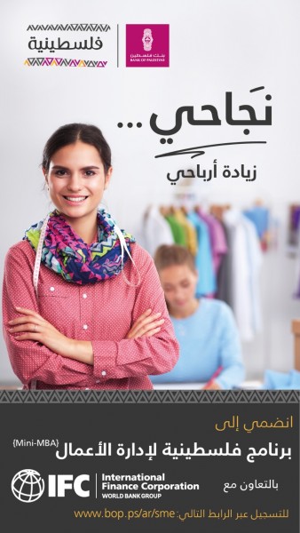 أعلن بنك فلسطين عن بدء استقبال الطلبات لبرنامجه الجديد تحت عنوان برنامج "فلسطينية لإدارة الأعمال" Mini MBA الذي اطلقه بالتعاون مع مؤسسة التمويل الدولية IFC. حيث أن هذا البرنامج يأتي ضمن برنامج البنك الرئيسي لدعم النساء الفلسطينيات "فلسطينية". و يهدف البرنامج الى تطوير مهارات العمل والقيادة للنساء الرياديات وصاحبات الأعمال، وتحفيز وتطوير النساء القياديات للشركات الصغيرة والمتوسطة في فلسطين من خلال تطوير مهاراتهن في مجالات مختلفة، منها؛ التخطيط الاستراتيجي والمالي، والتسويق، وإدارة الموارد البشرية، وغيرها. كما يقوم البرنامج على تطوير المهارات القيادية للمرأة، وتشبيكها مع خبراء دوليين ومحليين. وبخصوص بعض الفعاليات والدورات المرتبطة بهذا البرنامج سيجري تنفيذها بالتعاون مع منتدى سيدات الأعمال وشركة أرنست أند يونغ. وسيتم اختيار أفضل 20 سيدة من مناطق القدس والضفة الغربية وأفضل 20 سيدة من قطاع غزة للاشتراك في البرنامج الذي ستكون مدته خمسة أشهر.