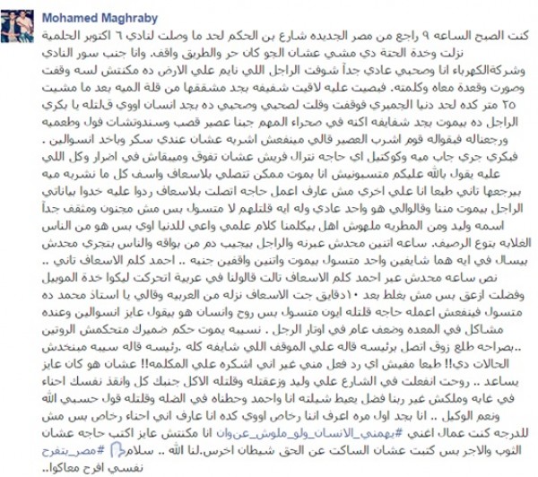 لم يكن يدرك محمد المغربي «أحد نشطاء الفيس بوك العامل فى مجال الإعلان» أنه سيري رجلا يموت أمام عينيه، ويقوم باستجداء الإسعاف لتنقذه من سكراته الأخيرة فتأبي بحجة «أنه متسول».