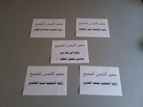 أبى أطفال وطلائع المخيم إلا أن يُطلقوا أسماء الشُهداء الأكرم منا جميعاً الذين سقطوا منذ بداية هذا الشهر على زوايا المخيم وهم الطفل الرضيع الشهيد دوابشة والطفل الشهيد أبو خضير والشهيد الخالدي والشهيد المصري وزاوية أين هم من يُنادون بحقوق الطفل.