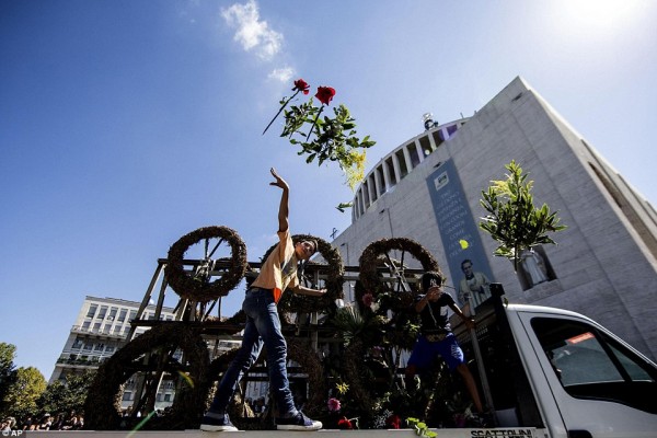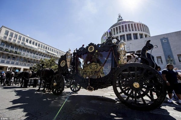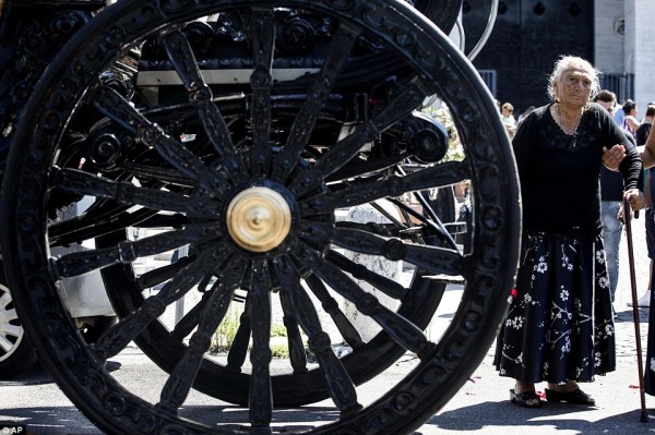 ودع المئات من أهالى روما في مشهد أشبه بمشاهد أفلام هوليوود، زعيم المافيا، فيتوريو كازامونيكا، في جنازة تقدمتها عربة ضخمة مطلية بالذهب تجرها الخيول على أنغام موسيقى فيلم The Godfather، بينما ألقت مروحية الورود على الجنازة خارج كنيسة "سان جيوفاني بوسكو"، حسبما ذكرت صحيفة ديلى ميل البريطانية.