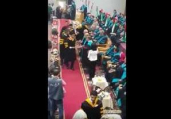 وتداول الناشطون عبر مواقع التواصل الاجتماعي مقطع فيديو يظهر بصق أحد طلاب جامعة جدارا "من مسافة قريبة" على أستاذه الجامعي أثناء حفل تخريج لأحد أفواج الجامعة.