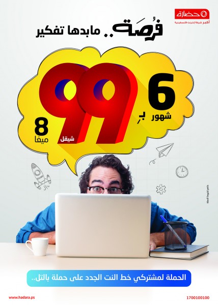و قال مدير عام شركة حضارةالسيد رامي قطينة أن حملة"فُرصة..ما بدها تفكير" تستهدف مشتركي حضارة الجدد الذين لديهم خط انترنت جديد من بالتل وذلك حرصاً منها على تقديم العروض والخدمات المميزة لهم ،فالعرض الحالي خاص بسرعة 8 ميجا بسعر 99 شيقل لمدة 6 شهور مع خصم 50% على خدمات شركة حضارة المضافة وبإمكان المشتركين الجدد الاشتراك بالحملة مرتين لمدة 3شهور .