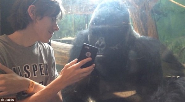 فاجأت غوريلا شاب التقط سيلفى معها داخل حديقة حيوان "لويز فيل" بولاية كنتاكى باهتمامها بالصورة الملتقطة، حيث أخذت تحدق في الهاتف بشدة، ثم أسندت رأسها على الحاجز الزجاجى لتشاهد الصور على الهاتف.