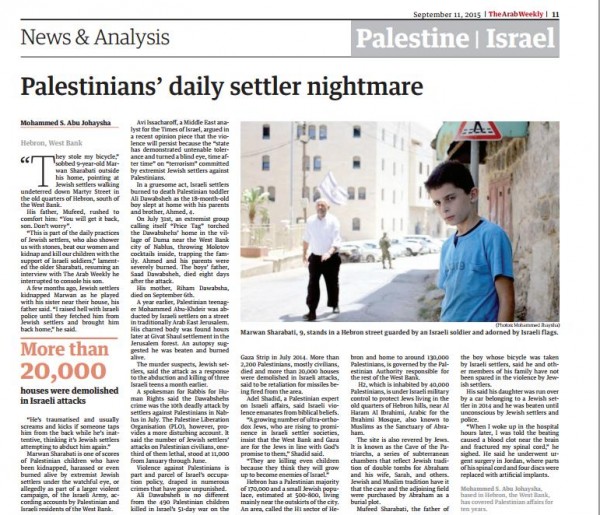 مروان ابن التسعة أعوام وقبل أن نسأله أين والدك، يستنجد بنا بأن نعيد له دراجته التي سرقها مستوطن إسرائيلي قبل وصولنا بدقائق، لم نستطع أن نساعده بشيء سوى مشاطرته حزنه ومحاولتنا التخفيف عنه بأن دراجته ستعود.