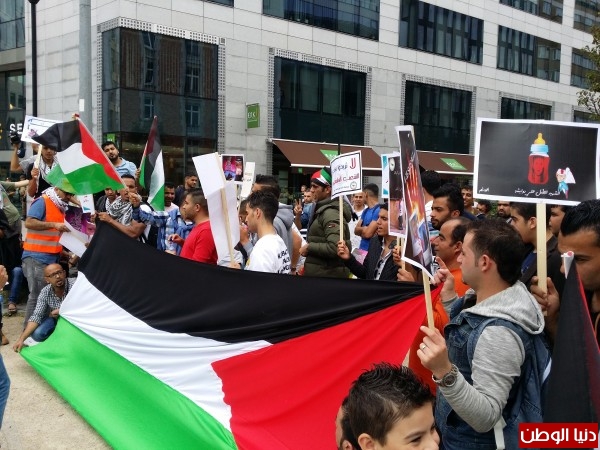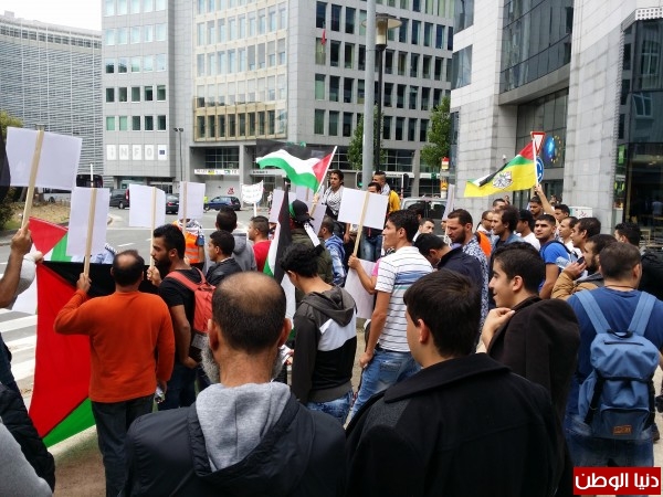 مظاهرة حاشدة امام مقر الأونروا ببروكسل تنديدا بقرارات الاونروا واحتجاجا علي حرق عائلة دوابشة