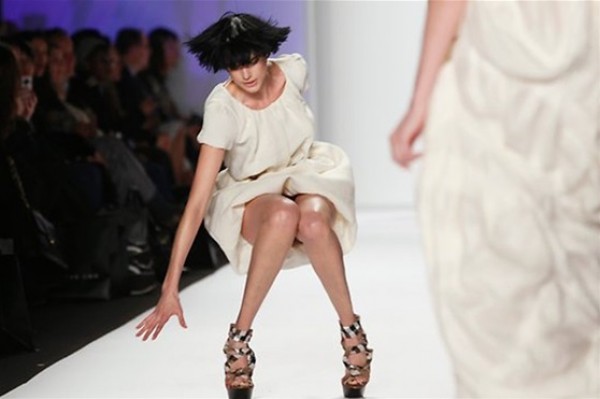 سقطت مجموعة من عارضات الأزياء على المنصة؛ بسبب حذائهن ذي الكعب العالي، أو بسبب ضيق فستانها، والبعض الآخر حاول إظهار كفاءتهن، فحاولوا الالتفاف وإتمام سيرهن الطبيعي، لكن تحولت ثقتهن إلى كارثة حيث فقدن التوازن بعد الالتفاف وسقطن على الأرض.