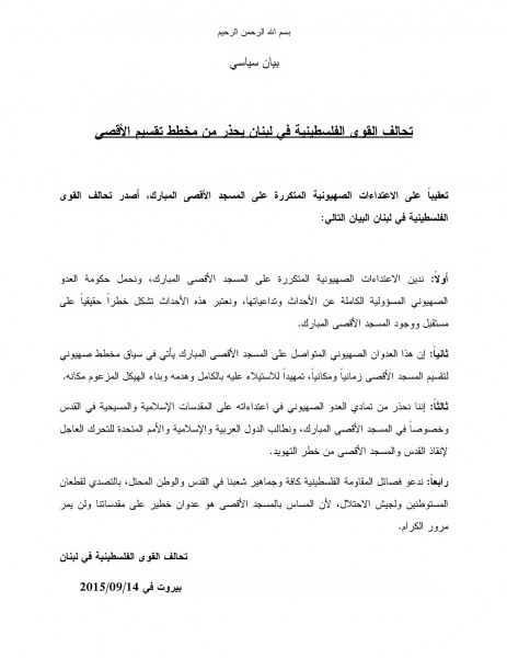 تعقيباً على الاعتداءات الصهيونية المتكررة على المسجد الأقصى المبارك، أصدر تحالف القوى الفلسطينية في لبنان البيان التالي:
