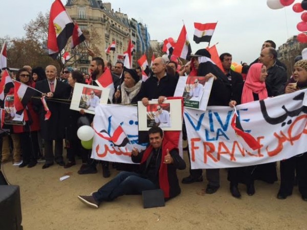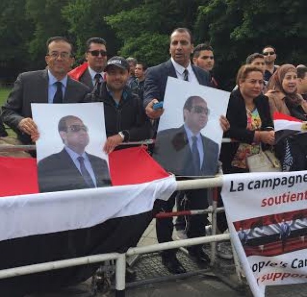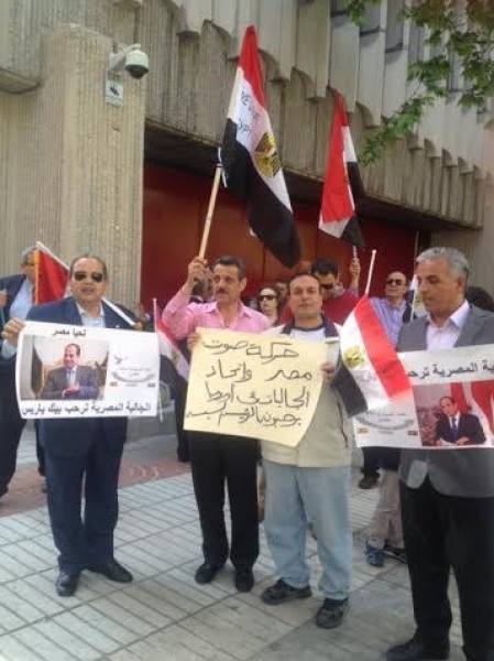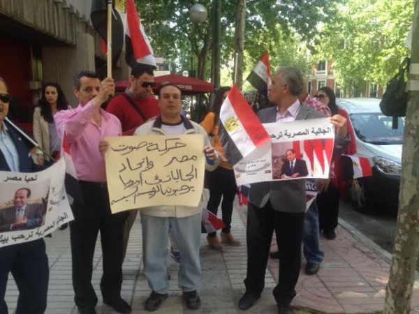 حيث تم تنظيم هذه الوقفة لمدة ساعتين من 12 حتى 2 ظهرا بتوقيت مصر وهو نفس توقيت اسبانيا و ذلك بعد ان حصل ابو الروس على تصريح رسمى من الجهات المخنصة الاسبانية بتنظيم وقفة والمشاركون فى الوقفة رفعوا عدة لافتات منها " تحيا مصر " و" حركة صوت مصر فى الخارج واتحاد الجاليات فى اوروبا يرحبون بالرئيس السيسى "و كلنا معك ياريس " والجالية المصرية فى مدريد ترحب بالرئيس" كما رفع المشاركون اعلام مصر وقبلها شارك حالد شقير منسق الحركة واعضاءها فى الاستقبال الحاشد للرئيس السيسى فى فرنسا وقال صلاح الدين انه من حسن حظ الحركة ان الرئيس السيسى نزل من سيارته لمصافحة المحتشدين فى اسبانيا حيث صافح المهندس ابراهيم ابو الروس منسق الحركة فى اسبانيا كما حيا فخامة الرئيس مستقبليه فى فرنسا عندما نزل لتحيتهم من سيارته وقام منسق الحركة فى فرنسا الاعلامى خالد شقير بالتقاط فيديو للحظة نزول الرئيس من سيارته ومصافحته مستقبليه .
