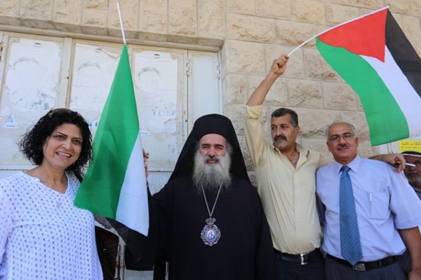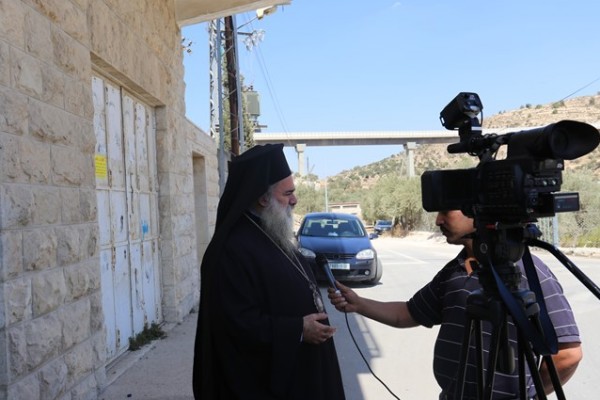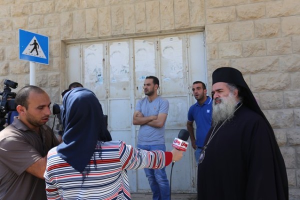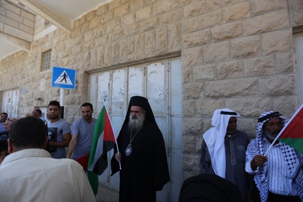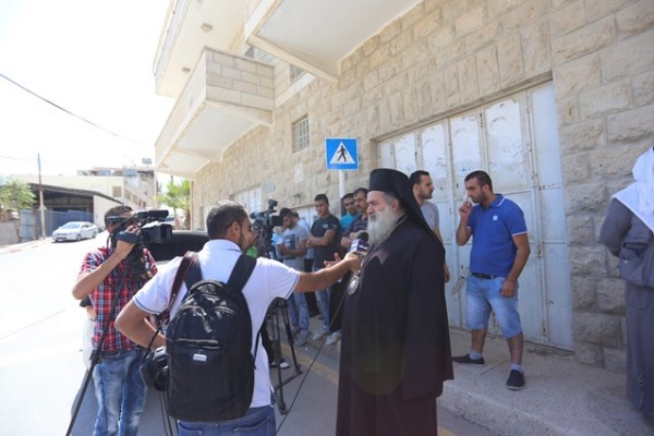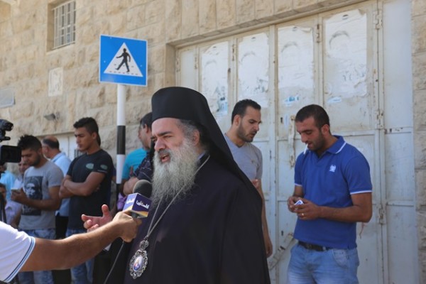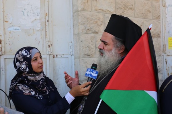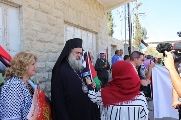 سيادة المطران قال في كلمته بأننا نلتقي اليوم مسيحيين ومسلمين في هذا المكان لكي نعبر عن رفضنا لسياسات الاحتلال الظالمة بحق شعبنا سواء كان هذا في القدس او في بيت جالا او في غيرها من الاماكن ، ويقف معنا اليوم اخوة لنا واصدقاء للشعب الفلسطيني اتوا من كافة ارجاء العالم من قوميات متعددة واديان مختلفة ولكن جمعتهم فلسطين التي يدافعون عنها باعتبارها قضية احرار العالم وقضية كل انسان شريف عنده قيم اخلاقية وحضارية .