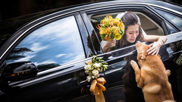 في الصورة عروس تودع كلبها في حفل زفافها.