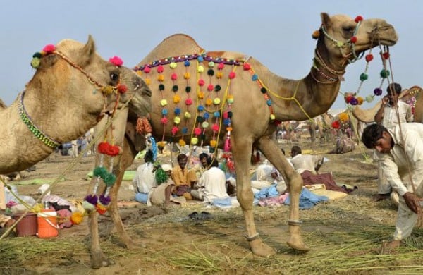 زين تجار المواشي في مهرجان لاهور بباكستان جمالهم بالورد والزينة وأزهى الألوان، حيث يستعدون لعرضها في السوق على الزبائن لشرئها في عيد الأضحى المبارك.