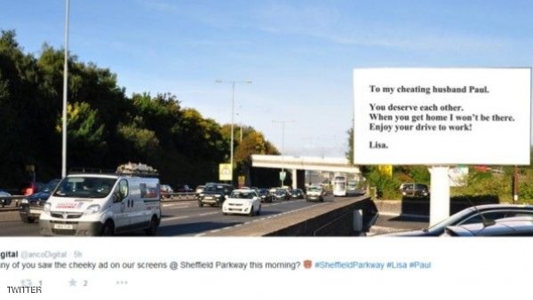 وجاء في الإعلان على الطريق العام "إلى زوجي المخادع بول.. إنكما تستحقان بعضكما بعضا.. عندما تعود إلى البيت لن أكون هناك.. استمتع بقيادتك إلى العمل.. ليزا".