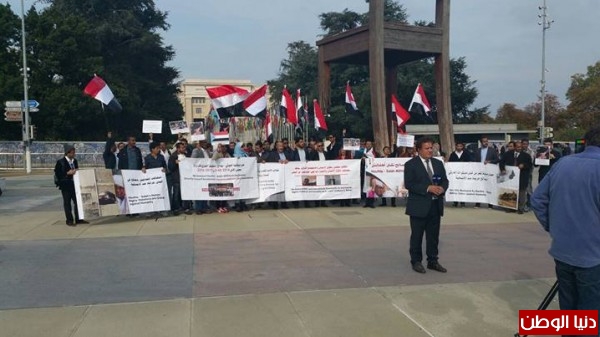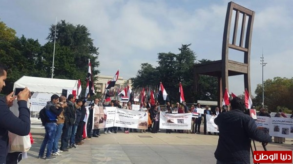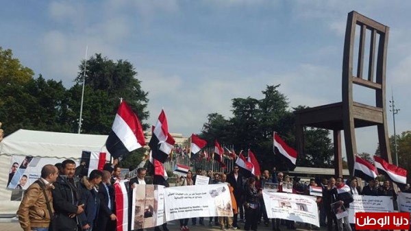 ناشطون وجاليات يمنية وعربية تنفذ وقفة إحتجاجية أمام الأمم المتحدة بجنيف ضد إنتهاكات الحوثي وصالح