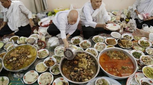 وداخل مباني المعبد، يوجد هياكل مليئة بالأسماك وأطباق من الخضروات والأرز بانتظار الرهبان. ويعتقد الكمبوديون أن الرهبان يمكنهم نقل الطعام إلى أرواح الموتى، بحسب فنامن تشاندارا ثاني أبرز راهب مكانة في المعبد.