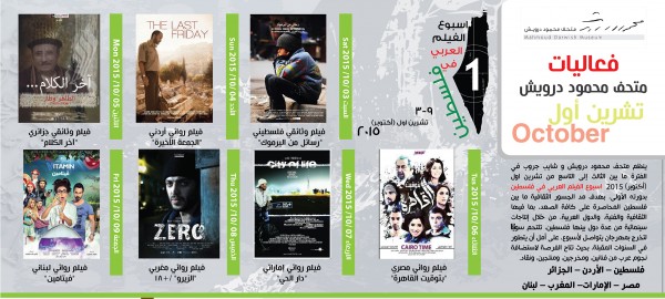 ينظم متحف محمود درويش و"شايب جروب" في الفترة ما بين الثالث إلى التاسع من تشرين الثاني (أكتوبر) 2015، أسبوع الفيلم العربي في فلسطين بدورته الأولى، بالتعاون مع "سينا بال"، والهيئة الملكية الأردينة للأفلاه، ومهرجان الاسكندرية السينمائي الدولي، وبدعم فني من مؤسسة الناشر، وبالشراكة مع شبكة راية الإعلامية، ورعاية إعلامية من كل من تلفزيون فلسطين، ومحطة 24 أف أم.