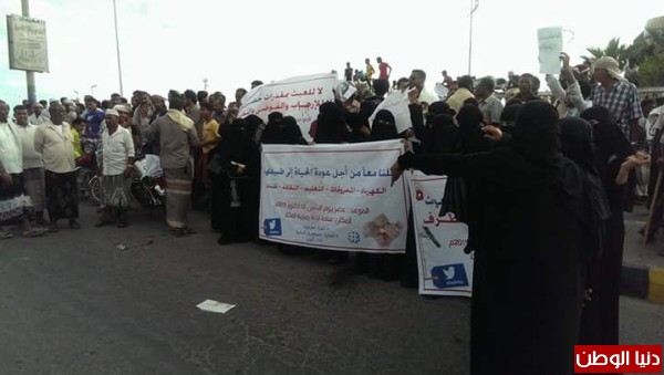 وهتف المشاركون بعدة شعارات تطالب باخراج القاعدة من حضرموت وانهاء حكم واعمال المجلس الاهلي الحاكم بقوة سلاح القاعدة رفعين شعارات تطالب التحالف الدولي
