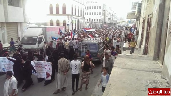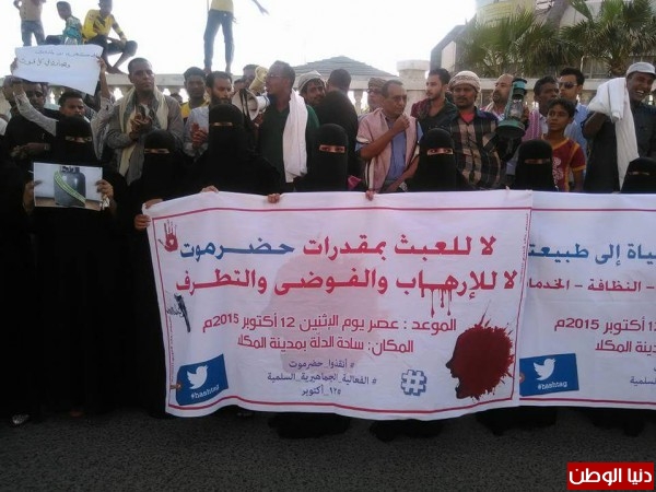شارك ألآلاف من كافة اطياف ومكونات المجتمع الحضرمي في مسيرة كبرى ومهرجان حاشدة ضمن سلسلة فعاليات وانشطة احتجاجية غاضبة سلمية دشنت في العشرين من الشهر الماضي بتنظيم من اتحاد العام للنقابات والاتخادات العمالية ومنظمات المجتمع المدني بحضرموت للمطالبة باخراج تنظيم القاعدة وانهاا احتلالهم لمدينة المكلا ومدن ساحل حضرموت وانهاء حكم المجلس الاهلي الحكم بقوة سلاح القاعدة .