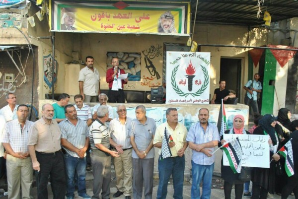 نظم "التجمع الوطني لاسر شهداء فلسطين"في لبنان، اعتصاما تضامنيا مع اهلنا المنتفضين في وجه الاحتلال الاسرائيلي، وذلك اليوم الثلاثاء 13-10-2015 عند المدخل الشمالي للمخيم " الحكومي"، امام شعبة حركة "فتح" في عين الحلوة ، بحضور ممثلي فصائل "منظمة التحرير الفلسطينية" واللجان الشعبية والاتحادات والمنظمات الشعبية ولجنة المهجرين من مخيمات سوريا واعضاء الهيئة الادارية للتجمع وعوائل الشهداء.