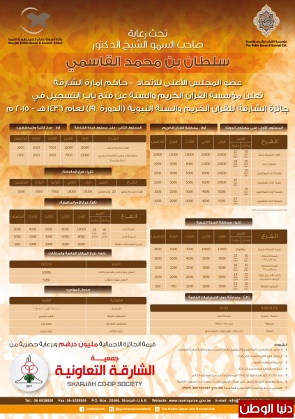 فتحت مؤسسة القرآن الكريم والسنة الحكومية بالشارقة باب التسجيل أمام المواطنين والمقيمين للمشاركة في جائزتها السنوية والتي تطلقها في شهر أكتوبر من كل عام (جائزة الشارقة للقرآن الكريم والسنة النبوية) في دورتها التاسعة عشرة لعام 1437ه_ 2015م.