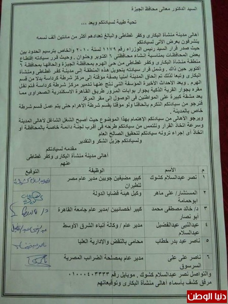 أهالى كفر غطاطى ومنشأة البكارى يطالبون محافظ الجيزة بنقلهم اداريا الى حى الهرم بدلا من كرداسة