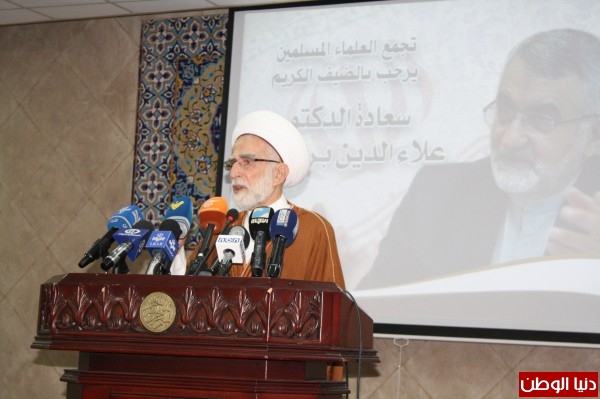 كلمة تجمع العلماء المسلمين ألقاها رئيس الهيئة الإدارية الشيخ الدكتور حسان عبد الله حيث قال: إنه لمن دواعي سرورِنا أن نستقبلَ اليومَ في مركزِنا الأخَ الكبيرَ رئيسَ لجنةِ الأمنِ القوميِّ والسياساتِ الخارجيةِ في مجلسِ الشورى الإسلاميِّ الإيرانيِّ السيد علاء الدين بروجوردي في لحظةٍ مِفْصَليةٍ من تاريخِ أمّتنا الإسلاميةِ حيث تُخاضُ اليومَ معركةٌ فاصلةٌ مع التكفيريينَ في سوريا والعراقِ ومن ورائهم الشيطانُ الأكبرُ أمريكا والكيانُ "الصهيونيُّ"وحكّامُ التخلُّفِ والعصبيةِ العرب. وفي وقتٍ امتشقَ الشعبُ الفلسطينيُّ بشبابِهِ اليافعِ السكينَ ليدافعَ لا عن كرامةِ فلسطينَ فحَسْب بلْ عن كرامةِ الأمةِ الإسلاميةِ عامةً.