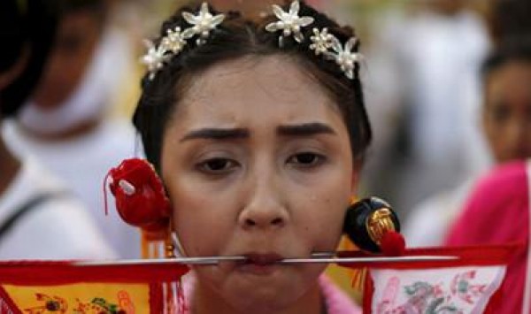 بالأسلحة البيضاء والآلية قطع مئات النساء التايلانديات وجوههن بأبشع الطرق الممكنة احتفالا بكونهم نباتيين، حيث غرسوا تلك الأسلحة فى خدودهن مباشرة، وغرسن المسامير دون توان، فى أغرب عيد دموى يشهده العالم كل سنة.