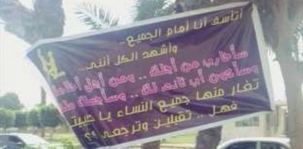 وكتب المواطن على اللافتة: “أتأسف أنا أمام الجميع وأشهد الكل أنني سأحارب من أجلك ومن أجل أحلامك وسأكون أب ثاني لك وسأجعلك ملكة تغار منها جميع النساء يا حبيبتي.. فهل تقبلين ّبذلك وترجعي”.