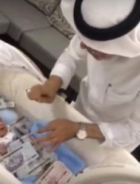 تداول مستخدمو مواقع التواصل الإجتماعي مقطع فيديو لجدٍّ سعودي يحتفل بولادة حفيده على طريقته الخاصة، موثقاً ترحيبه به في منزله بإهدائه آلاف الريالات ونشرها على جسده بطريقة غريبة. ويظهر الجدّ من خلال المقطع وهو يقوم بنثر أوراق مالية من فئة الـ 100 و500 ريال حول الحفيد وهو يردّد "هذه سمايتك وقليلة في قدرك.. تستاهل.. الله يحييك ومرحبًا في بيت جدك"، داعياً له بالصلاح وأن "يبارك الله فيه" وواعدًا بالتكفل بزواجه عندما يكبر.