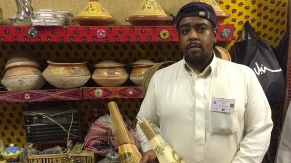 عبدالله يتخذ من سوق المسوكف مقرا، باعتباره مكانا للحرفيين السعوديين، ليعرض أحدث منتجاته الفنية التي صنعها من كرب النخيل.