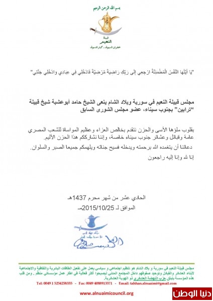 مجلس قبيلة النعيم في سورية وبلاد الشام ينعى الشيخ حامد أبوعشبة شيخ قبيلة “ترابين” بجنوب سيناء، عضو مجلس الشورى السابق