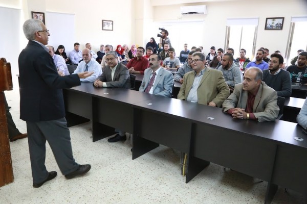 الدكتور محمود الجعفري عميد كلية الاعمال والاقتصاد، والدكتور رشيد الجبوسي مدير مكتبات جامعة القدس، بالاضافة إلى أعضاء هيئة التدريس في كلية الأعمال والاقتصاد وممثلين عن المجتمع المحلي وطلبة جامعة القدس.