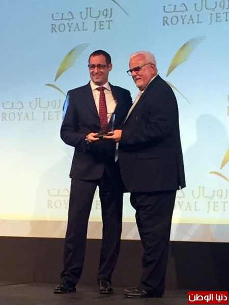 التعليق على الصورة: جيف ويلكينسون، نائب أول الرئيس للشؤون الفنية بالاتحاد للطيران، يتسلم جائزة "مزود خدمات الصيانة والإصلاح والعَمرة للعام بمنطقة الشرق الأوسط" التي فازت بها "الاتحاد للطيران الهندسية" في حفل جوائز "أفييشن بزنس" لعام 2015 من الكابتن باتريك جوردن، الرئيس والمدير التنفيذي بالإنابة لشركة رويال جت.