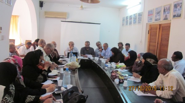 شهدت قاعة مركز اليمن لدراسات حقوق الانسان بخورمكسر يوم الثلاثاء الموافق 27-اكتوبر-2015 فعالية لقاء تشاوري لشخصيات احتماءيه واكاديميين ومنظمات مجتمع مدني حول: الوضع في عدن وشراكة المجتمع في دعم جهود السلطة المحلية