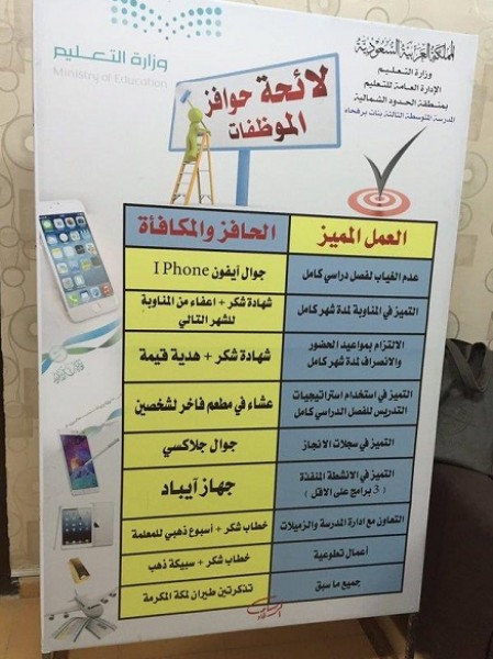 وكانت مديرة المدرسة المتوسطة الثالثة بنات برفحاء بمنطقة الحدود الشمالية قد نشرت لائحة بالجوائز في حال تميزهن في استراتيجيات التدريس وعدم غيابهن وتعاونهن مع إدارة المدرسة، وفقاً لصحيفة عاجل الإلكترونية السعودية.