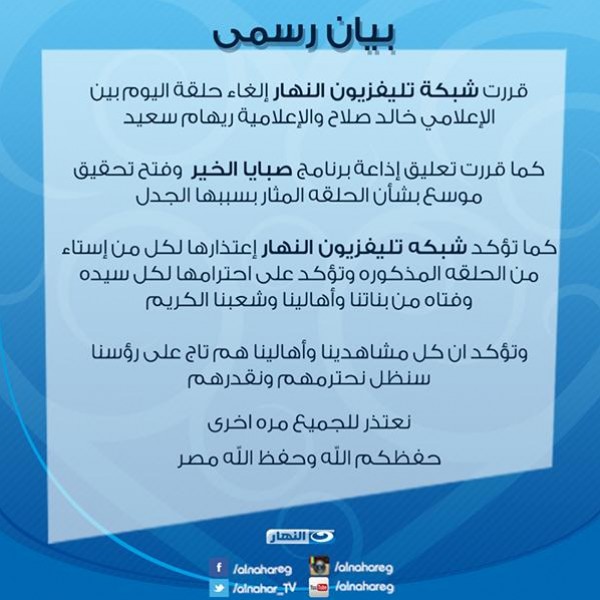وكانت قناة النهار قد أصدرت بيانا أعلنت فيه تعليق اذاعة برنامج صبايا الخير وفتح تحقيق موسع بشأن الحلقة المثار بشأنها الجدل.