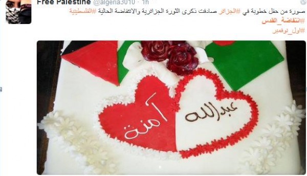 وزيّنت "الجاتوه" أعلام فلسطين والجزائر وقال احد ناشري الصورة انها من حفل خطوبة للعريسين عبدالله وآمنة حيث صادفت ذكرى الثورة الجزائرية مع الهبة الجماهيرية الحالية .