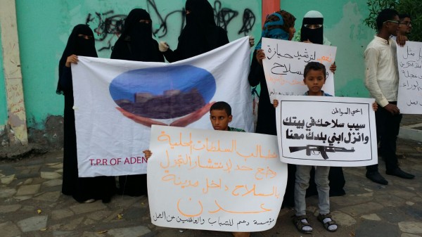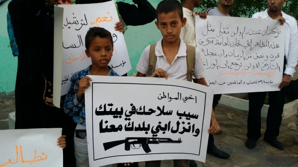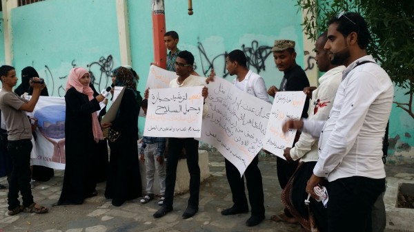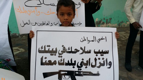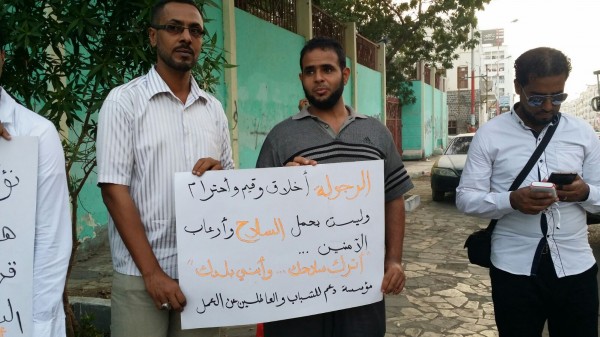 نظمت مؤسسة دعم للشباب والعاطلين عن العمل عصر يوم الاثنين 2 نوفمبر 2015م امام مكتب السلطة المحلية بالمعلا وقفة تضامنية تحت شعار ( إترك سلاحك في البيت ...وإبني بلدك ) وتعد هذه الوقفة تدشين لحملة ( إترك سلاحك وإبني وطنك ) شارك بالوقفة التضامنيه أبناء شعب الجنوب من منظمات المجتمع المدني ونشطاء واعلاميين رفعوا خلال الوقفة الشعارات المناهضة لحمل السلاح بالعاصمة عدن والرافضة لانتشار ظاهرة حمل السلاح والتجول بها بالمدن وتنظيم عملية حمل وحيازة السلاح بالشوارع مطالبين السلطات المحلية بضرورة وضع حد حازم لهذه الاعمال والمظاهر الغير مسئولة التي تسبب الفوضى للمواطن واقلاق السكينة وماتخلفه من ضحايا بسبب استخدام الرصاص الحي بشكل عشوائي في الاحياء السكنية .