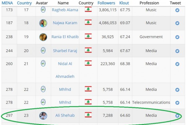 بحسب تصنيف موقع Top 100 Arabs للشخصيات الأكثر تأثيرا في الإعلام الاجتماعي، فقد حللتُ في المركز 23 في لبنان وفي المرتبة 297 على صعيد الشرق الأوسط وشمال