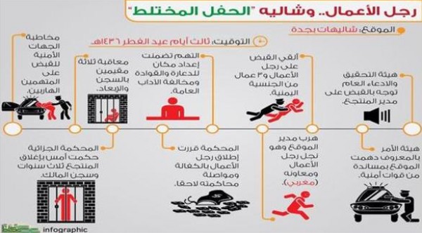 وكانت هيئة الأمر بالمعروف والنهي عن المنكر قد دهمت الموقع بمساندة من قوات أمنية، حيث ألقي القبض على رجل الأعمال وعدد من المشاركين والمسؤولين عن المنتجع، في حين هرب مدير الموقع وهو نجل رجل الأعمال ومعاونه (مغربي الجنسية) وصدرت مذكرة من الادعاء العام بالقبض عليهما.