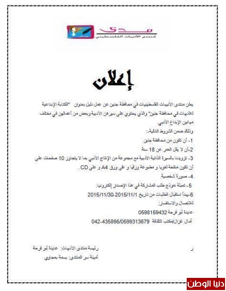 حيث سيتم بعد جمع هذه المعلومات التواصل مع الكاتبات والحصول على نموذج لأهم وأحدث الأعمال الأدبية لكل مشاركة في الدليل للمساهمة في توثيق المسيرة الأدبية في المحافظة . ومنتدى الأديبات الفلسطينيات هو جمعية خيرية ثقافية تعمل في المجال الثقافي وتركز مجهودها على دعم وترسيخ حضور المرأة في المجال الأدبي والإبداعي تم تأسيسه في العام 2012 ليجمع الكاتبات والشاعرات من محافظة جنين.