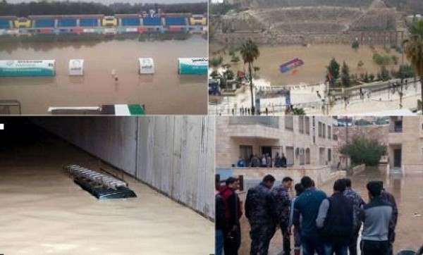 وتجتاح الأردن سيول وأمطار غزيرة جراء تأثرها بمنخفض جوي غير مسبوق يضرب منطقة الشام ومصر .