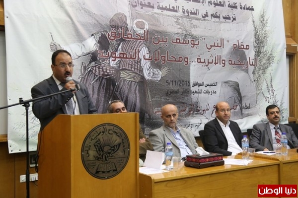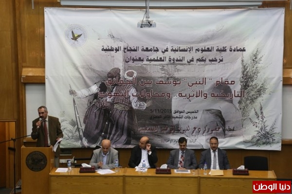 نظمت كلية العلوم الانسانية في جامعة النجاح الوطنية اليوم 5/11/2015 ندوة علمية بعنوان مقام "النبي" يوسف بين الحقائق التاريخية والاثرية ومحاولات التهويد، والتي هدفت للتعريف بالتحديات التي تواجه المقام المذكور في ظل الظروف التي يعيشها الوطن. وافتتحت الندوة بكلمة ترحيبية للدكتور عامر القبج رئيس قسم التاريخ مؤكدا على أهمية عقد مثل هذه الندوات.
