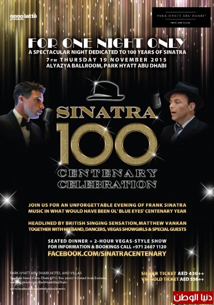 يقام احتفال كبير في فندق وفيلات بارك حياة أبوظبي بجزيرة السعديات , بمناسبة مرور مائة عام علي ميلاد المطرب العالمي فرانك سيناترا وذلك في السابعة مساء يوم 19 نوفمبر الجاري.